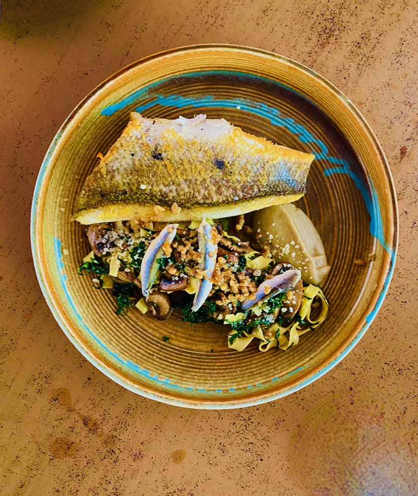 confit chicken gizzards, blue & red grits, red pea, celery root puree, amarynth Chorizo, leek, mascarpone, shishito